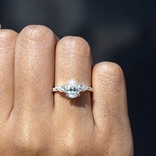 Three Stone Engagement Ring Featuring 1.33 CT Pear Moissanite