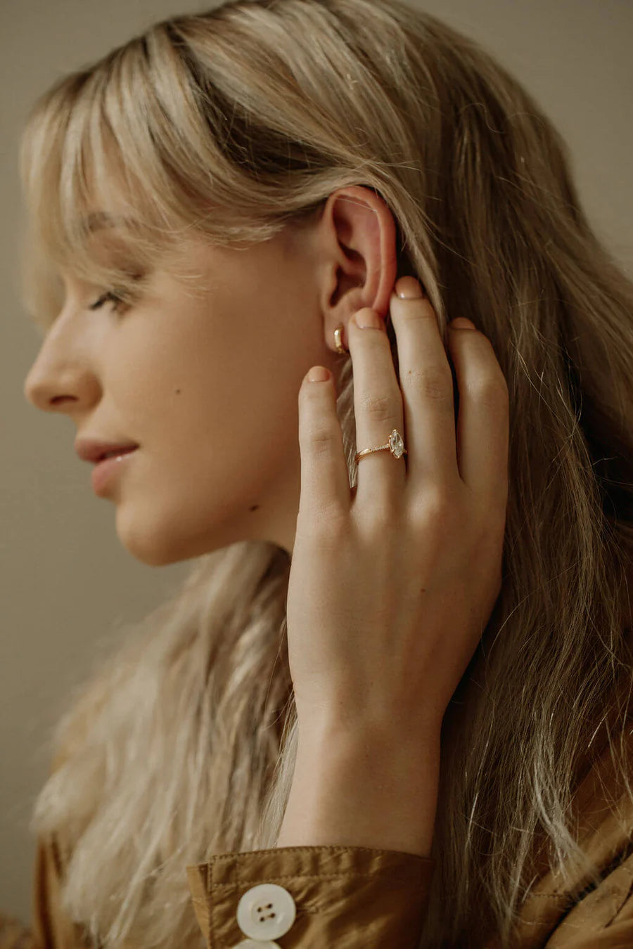 14 karat yellow gold contains 58.5% pure gold and 41.5% alloy. It offers a soft, warm golden hue that is both timeless and elegant. This alloy is especially flattering on fair skin tones and pairs beautifully with champagne and coloured moissanites, allowing the gemstone’s natural vibrancy to take centre stage.