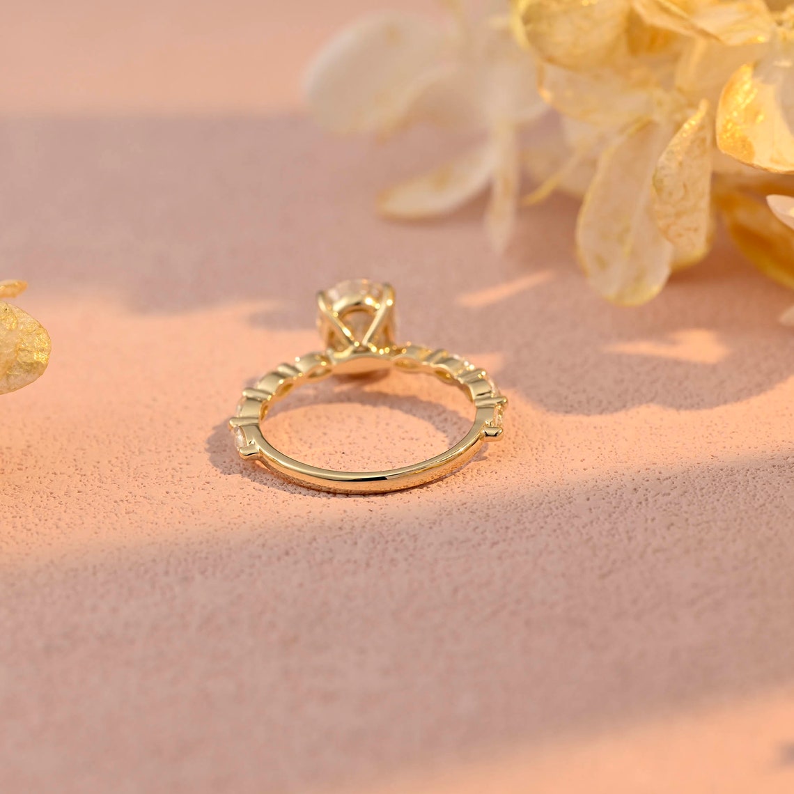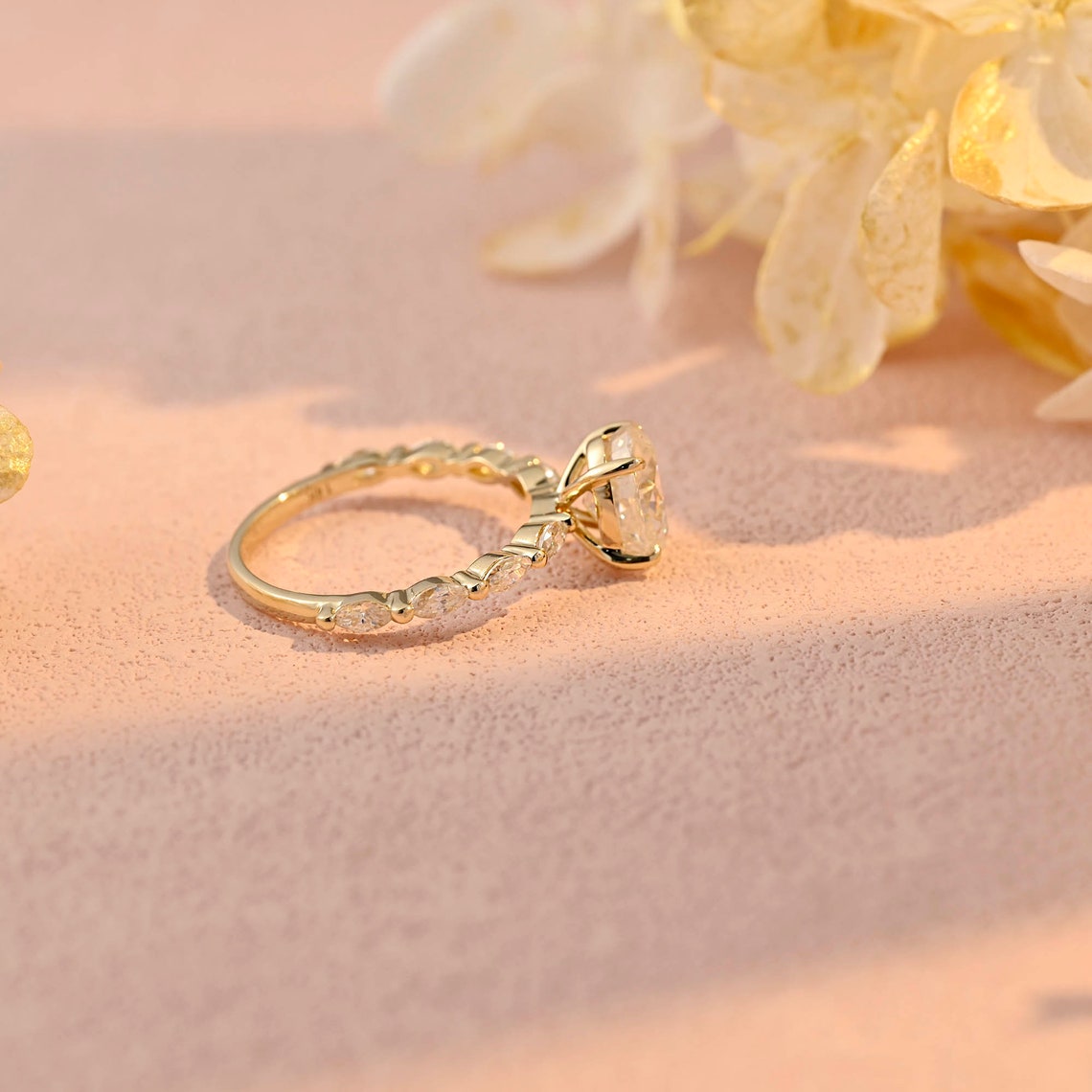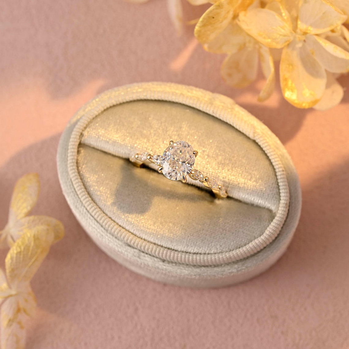 Center Stone: 2.0 CT Oval Moissanite, DEF Color, VVS Clarity