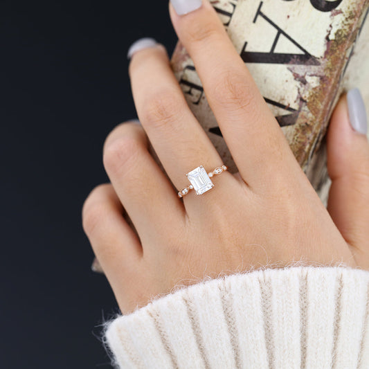 Milgrain Pave Engagement Ring Featuring 1.60 CT Emerald Moissanite