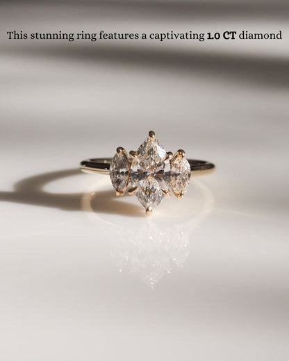 Crafted to perfection, this ring combines a modern three stone design with a classic marquise cut center stone. The band’s smooth finish and comfortable fit make it ideal for everyday wear. Whether it's an engagement or a special gift, this piece shines with timeless elegance.
