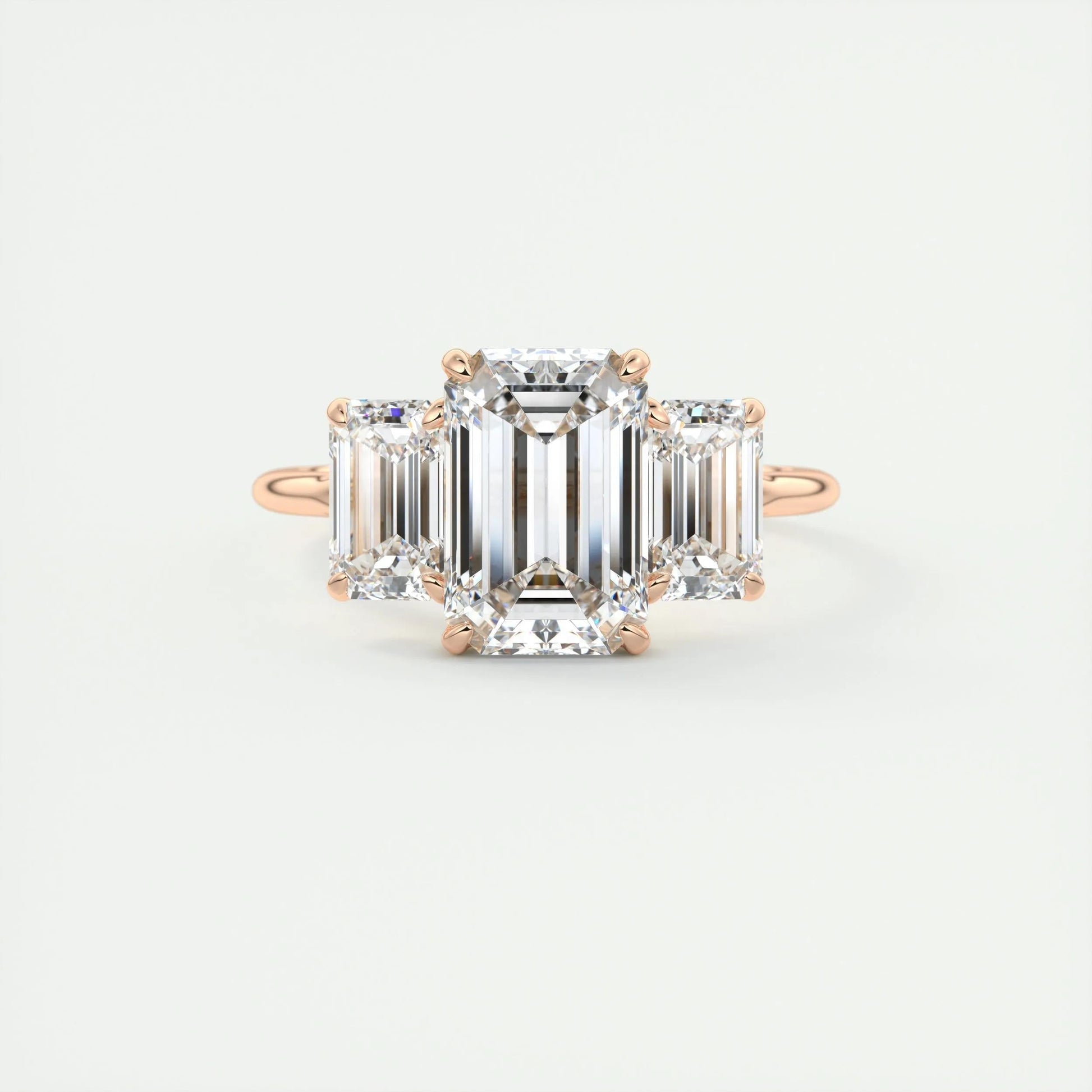 Crafted to perfection, this ring combines a modern three stone design with a classic emerald cut center stone. The band’s smooth finish and comfortable fit make it ideal for everyday wear. Whether it's an engagement or a special gift, this piece shines with timeless elegance.
